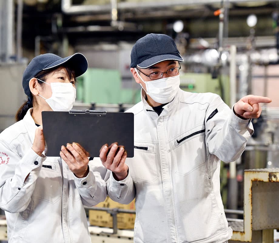 入社時は製品課で充填ラインを担当し、その後、醸造課で酒造りを学び、製品課へ異動しました。現在は製品課の統括課長として、製品課が一つにまとまり、お互いに協力し、助け合える働きやすい環境を目標に、日々みんなとコミュニケーションをはかりながら業務に取り組んでいます。